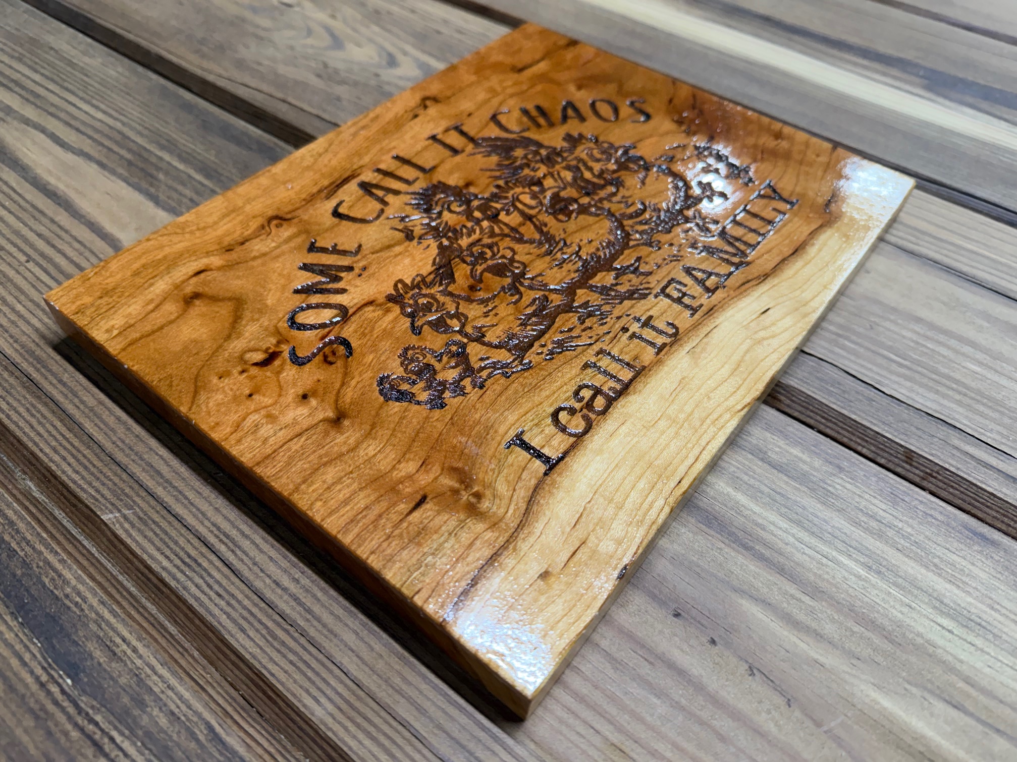 Handcrafted, Rustic, Hardwood Sign, Cherry, Laser Engraved, Matthew 6:11, "SOME CALL IT CHAOS I call FAMILY", Dimensions 11" X 8" X .75" (protected with a poly coated, clear, satin finish)
